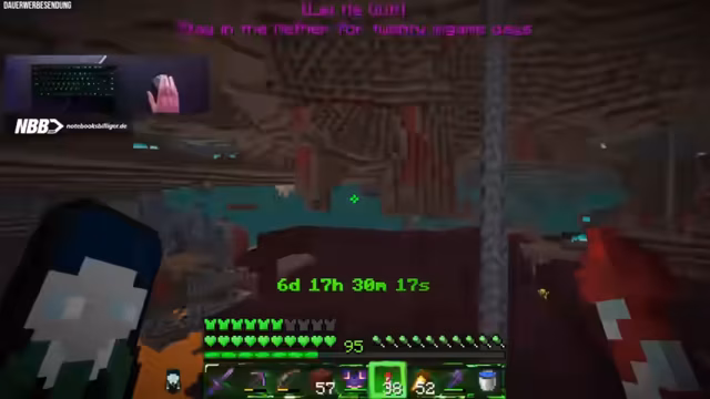 01:46:25Der Fortschritt beim aktuellen Achievement, das '20 Tage im Nether am Stück', wird erwähnt. Das Ziel wurde in 6 Stunden und 40 Minuten erreicht. Es wird eine neue Partnerschaft mit 'NBB' angekündigt und die bisherigen goldenen Karotten als Absurdität bezeichnet. Auch die Dauer der Partnerschaft mit 'NZXT', die vor drei Jahren auslief, wird kurz angesprochen.