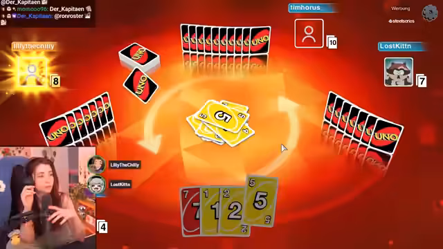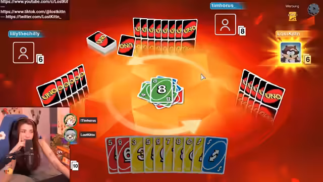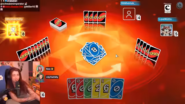 01:14:40Die Uno-Session setzte sich fort, mit anhaltendem Spaß und gelegentlichem Frust über das Spiel. Baso und ihre Mitspieler (Tim, Lilly und Lost Kitten) spielten mehrere Runden, wobei die Strategien manch als "böse" oder "toxisch" beschrieben wurden. Baso versuchte während des Spiels, humorvoll zu bleiben, auch wenn sie mehrere Karten auf der Hand hatte oder unfaire Spielzüge vermutete. Trotz der Unannehmlichkeiten des Spielen verbrachte sie den Abend mit den Freunden und genoss die Gemeinschaft.