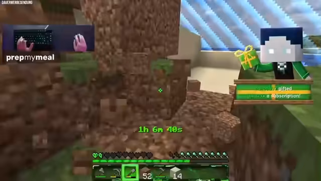 01:11:47Nachdem ein Setzling der ersten Birke gepflanzt und der erste, vorsichtige Schaden einkalkuliert wurde, konzentriert sich der Streamer auf den langfristigen Aufbau der Infrastruktur. Ein erstes kleines Haus als sicherer Rückzugsort wird errichtet. Nahrung ist durch den Anbau von Weizen kein Problem, der Fokus liegt stattdessen auf der dringend benötigten Heilung durch Pilze, Eisen für Werkzeuge und Rüstung sowie der Ausleuchtung der Umgebung mit Kohle, um gefährliche Monster-Spawnings zu verhindern.