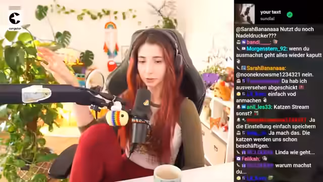 00:09:36Der Stream beginnt frühzeitig um 12 Uhr, was für den Streamer ungewöhnlich ist. Sie erklärt, dass die Katzen für den frühen Start verantwortlich seien, da sie den Stream angemacht hätten. Zu Beginn des Streams wird das helle Tageslicht im Streamingzimmer thematisiert, was die Bildqualität beeinträchtigt. Die Streamerin beschreibt ihre Vorliebe für ihr helles, lichtdurchflutetes Zuhause und die Freude, die ihr viele Pflanzen an den Fenstern bereiten, insbesondere wenn diese Regenbogenfarfen werfen.