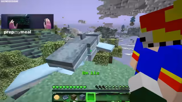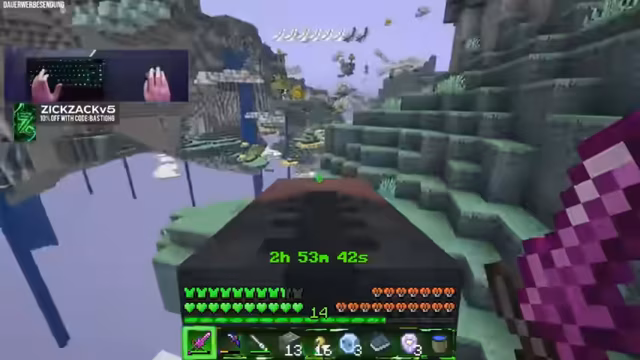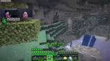 00:57:53Schnell stellt sich heraus, dass die Aether-Dimension nicht ungefährlich ist. Slimes, die bei Kontakt Schaden verursachen, und schießende Kreaturen stellen eine ständige Bedrohung dar. Beide Spieler verlieren schnell Lebenspunkte und müssen sich mit der Nahrungssuche beschäftigen, um ihre Gesundheit regenerieren zu können. Gleichzeitig wird mit dem Holy Stone ein weiteres wichtiges Erz abgebaut, das als Brennstoff und zur Herstellung von Holy-Stein-Planks dient, um fortgeschrittenere Werkzeuge zu craften.