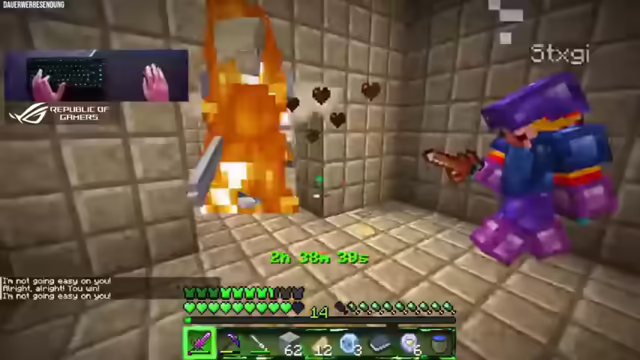 03:35:19Ein Miner fällt herunter, wird aber gerettet. Es wird nach einer Insel mit vielen goldenen Bäumen gesucht, was ein seltenes Biom sein soll. Das Fire-Aspekt-Schwert kann nicht direkt gebratenes Essen geben. Es wird überlegt, ob das Anschauen von Videos auf dem Handy während des Streams in Ordnung ist. Es wird die Spontanität des Streams mit Stegi gelobt. Es wird gemeinsam nach dem goldenen Biom gesucht. Die Flugfunktion wird als cool empfunden. Es wird ein Tempel entdeckt, der angsteinflößend aussieht. Der Tempel wird als Fiberbestellung bezeichnet. Ein Gespräch mit dem Boss beginnt, der sagt, dass Menschen dort nichts zu suchen haben. Der Boss droht mit seiner Burning Aura. Es wird ein Bett draußen platziert. Der Boss sieht aus wie ein schwebender Donkey Kong. Der Boss kann nichts anbieten und möchte in Frieden gelassen werden. Es wird überlegt, Wasser über ihn zu kippen. Der Boss sagt, solange er lebt, wird die Sonne niemals untergehen, was im Äther zutrifft. Der Boss fordert den Spieler heraus und droht mit Rache. Der Boss überschätzt sich ein bisschen. Der Boss kann nicht so viel Damage machen. Der Boss hat ein 90 Grad Movement. Man muss die Eiskristalle auf ihn schießen. Die Boss-Mechanik ist ultra gut. Die Lanze ist super. Das Eis ist gut zu sehen. Es geht um die Idee des Bosses.