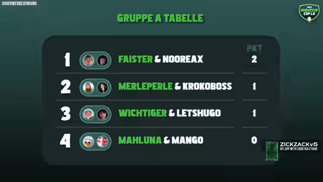 00:22:29Die Auslosung der Teams für die Gruppen A und B steht bevor. Der Streamer erinnert die Teilnehmer daran, ihre Cams einzubinden, da dies Voraussetzung für die Teilnahme ist. Die Auslosung findet in einer Minecraft-Welt statt. Die Teams werden vorgestellt, darunter Papaplatte mit ohne Pixel, Let's Hugo und Wichtiger, Cars Crafter und Stegi, Maluna und Mango, Sydney und Willi, Adi und Maelo, Kroko und Merle sowie Feister und Noriax. Lenly gibt Einschätzungen zu den einzelnen Teams ab, wobei Cars Crafter und Stegi sowie Sydney und Willi als Favoriten gehandelt werden. Adi und Maelo werden als ausgeglichenes Team hervorgehoben, während Feister und Noriax als Geheimtipp gelten. Für jeden 5k(perfekter Score) gibt es 200 Euro extra.