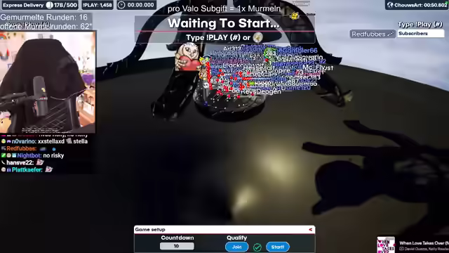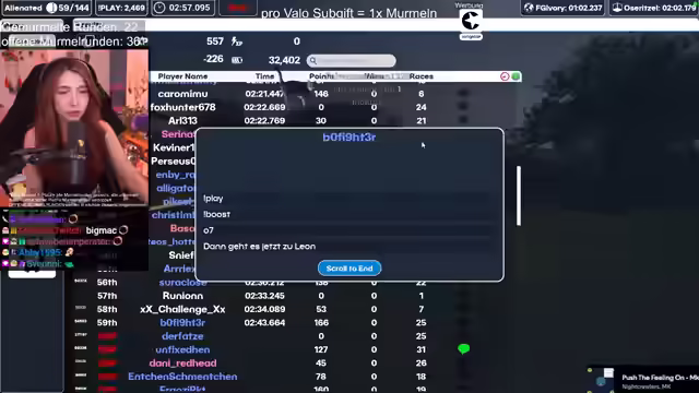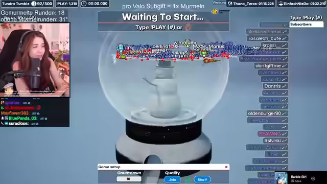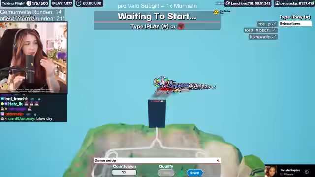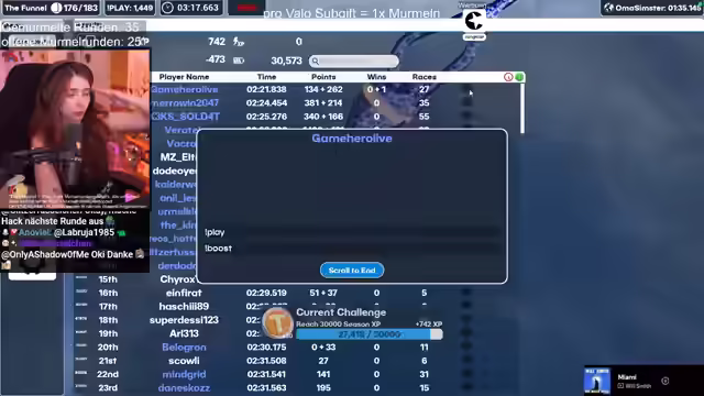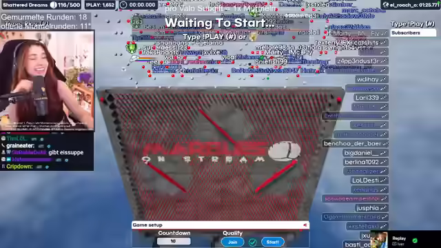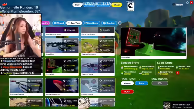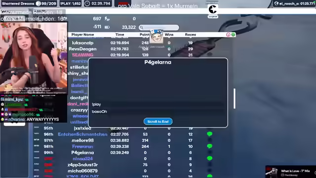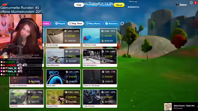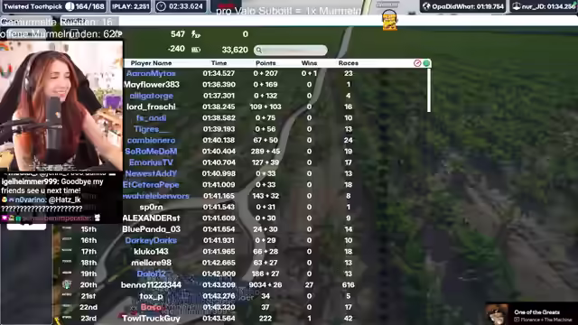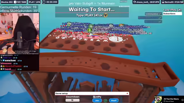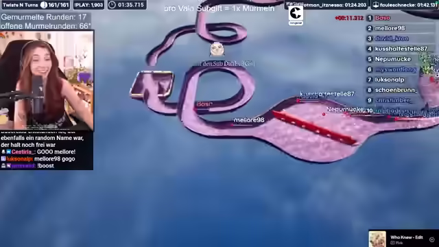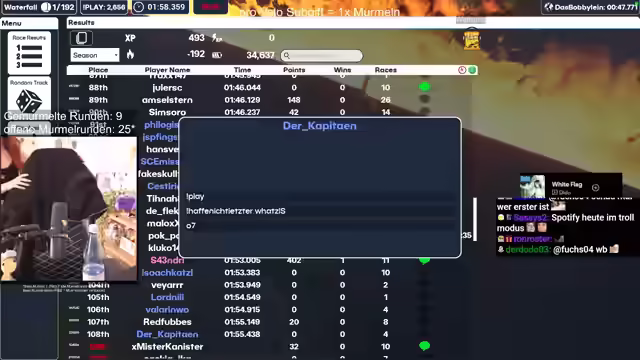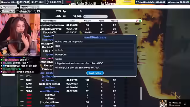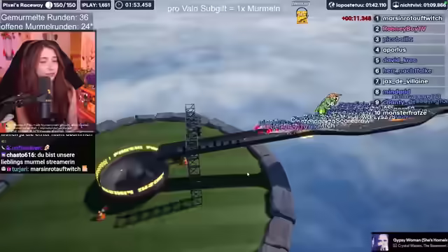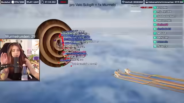 02:32:32Einem Zuschauer namens Wunschname wird zum Geburtstag gratuliert, inklusive Feuerwehr-Alarm-Soundeffekt. Der Versuch, ein Geburtstagslied zu spielen, scheitert an fehlenden Glasgegenständen. Es wird sich bei Zuschauern für Sub-Gifts und Resubs bedankt. Es wird festgestellt, dass es sich um die 26. Murmelrunde handelt, die zum vierten Mal gespielt wird. Zuschauer werden aufgefordert, mit '!play' im Chat mitzumachen, wobei dem ersten im Ziel ein Sub oder VIP winkt und der letzte möglicherweise gebannt wird. Die Mods werden versehentlich nicht über die Murmel-Aktion informiert, was zu potenziellen Problemen führt. Es wird eine Liste der gebannten Personen gefordert, um sie später wieder entbannen zu können. Die aktuelle Map mit Toren wird als 'übel scammed' bezeichnet, da der erste Platz keine Garantie für ein Weiterkommen ist. Ein VIP-Zuschauer wird aufgezogen, und ein anderer verlässt den Stream. Es wird mit den Murmel-Teilnehmern gescherzt und ihnen Angst gemacht.