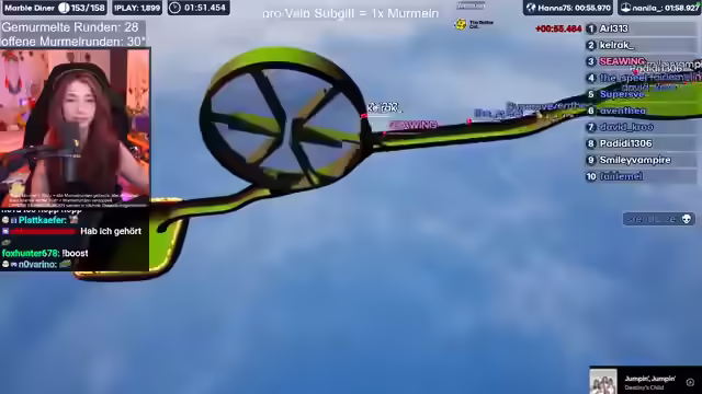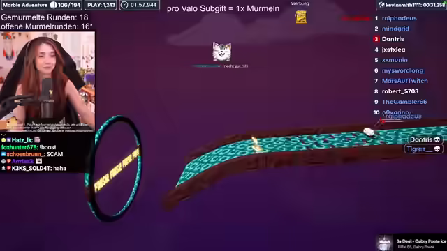 02:28:44Es wird überlegt, die Murmelrunden hochzuzählen, um am Ende des Streams die genaue Anzahl zu kennen. Die aktuelle Map wird als 'Scam' bezeichnet, da viele Murmeln aufgrund von Portalen und unvorhersehbaren Elementen nicht ins Ziel kommen. Es wird ironisch kommentiert, dass einige Maps mit Portalen immer problematisch sind und niemand das Ziel erreicht. Die Schwierigkeit der Map führt dazu, dass Teilnehmer gebannt werden, selbst wenn sie auf Position 21 liegen, was als 'illegal' bezeichnet wird. Ein trauriger Song wird abgespielt, wenn jemand gebannt wird, was zu Spekulationen führt, ob Spotify die Bans erkennt. Eine 2000er-Hits-Playlist wird als Hintergrundmusik verwendet und im Chat verlinkt. Ein VIP wird an einen Sub vergeben, und es wird festgestellt, dass die Subs sich endlich anstrengen. Die Anzahl der gespielten Murmelrunden wird diskutiert, wobei Unsicherheit über die genaue Zahl herrscht. Es wird festgestellt, dass es sich um die 26. Runde handelt.