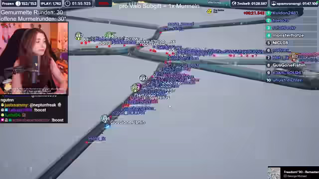 01:55:43Es wird eine neue Regel vorgeschlagen: Wenn die Murmel des Streamers Erster wird, werden alle Murmelrunden gelöscht; wenn sie Letzter wird, werden sie verdoppelt. Dieser Vorschlag wird angenommen, aber es wird klargestellt, dass nicht alle Murmelrunden im aktuellen Stream gespielt werden müssen. Es wird weiter gemurmelt, und bei einer Runde gewinnt Schwabenimperator, der daraufhin VIP wird. Lia wird für den letzten Platz gebannt. Es wird befürchtet, dass Zuschauer durch die Bann-Regel abgeschreckt werden und nicht mehr zurückkommen. Es wird betont, dass der Bann nur "vielleicht für immer" ist. Es wird eine neue Murmelrunde gestartet, und Zuschauer werden daran erinnert, dass sie mit dem Befehl "!play" den Murmel-AGBs zustimmen.