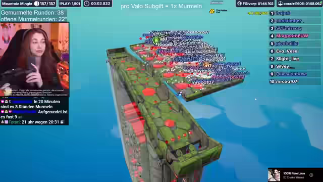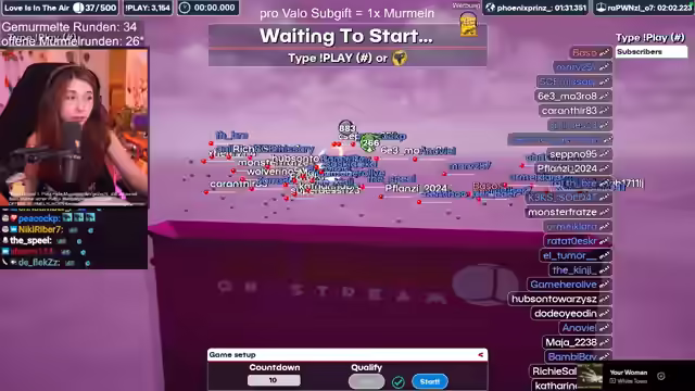 03:48:07Es wird sich bei Subscribern bedankt, die sich anstrengen, Erster zu werden, damit die Streamerin keine Subs mehr verschenken muss. Jenny wird für 25 verschenkte Subs gedankt, und Valorant hat zusätzlich sechs Subs beigetragen. Es wird vermutet, dass eine Person, die vorhin gebannt wurde, mit den Murmeln zu tun hat, aber die Streamerin ist sich nicht sicher. Aaron Mythos erhält ein VIP geschenkt. Es wird erklärt, dass heute Sub-Bate-Tag ist, um die Valorant-Sub-Gifts auszunutzen. Vor drei Tagen wurden Spenden für den guten Zweck gesammelt, und heute werden Subs für die Streamerin gesammelt. Es wird betont, dass man über alles reden kann, und es wird sich über den Verlust eines Teilnehmers im Murmelspiel lustig gemacht.