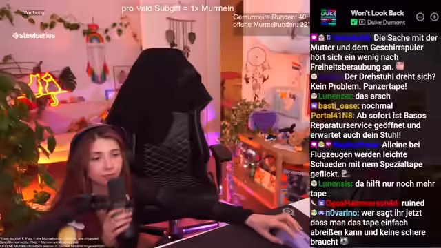 02:56:24Es wird angekündigt, dass im Laufe des Streams der Stuhl mit schwarzem Tesaband geklebt werden soll, da er immer mehr kaputt geht. Es wird sich gefragt, warum alles kaputt geht. Der ehemalige Mitbewohner Labubo ist ausgezogen. Es wird befürchtet, dass der Schreibtisch mitten im Stream zusammenbricht. Die nächste Murmelrunde wird gestartet, wobei der Streamer versehentlich nicht joint. Zuschauer werden aufgefordert, den Stuhl vor dem Tapen zu entfetten. Ein Zuschauer gewinnt, aber der Streamer hat nicht aufgepasst. Ein VIP wird im Chat vergeben, und es wird erklärt, wie der Emote-Only-Mode für VIPs funktioniert. Es wird demonstriert, wie VIPs und Mods im Emote-Only-Mode '!play' schreiben könnten, was die Wahrscheinlichkeit für andere Teilnehmer erhöhen würde, gebannt zu werden. Es wird betont, dass VIPs nichts mehr zu gewinnen haben. Die Machtdemonstration mit den VIPs hat Spaß gemacht. Es wird sich vorgestellt, wie Zuschauer, die nicht in den Chat schreiben konnten, trotzdem '!play' schreiben wollten, aber es nicht ging. Der Streamer erklärt sich zum Matriarchat bereit und bietet an, alle VIPs gegeneinander antreten zu lassen.