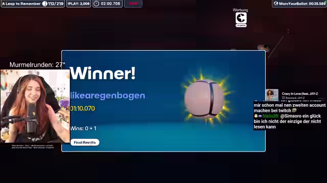 02:16:19AiloSmilo erhält einen VIP-Status. Es wird festgestellt, dass der Sub-Bate-Stream nicht gut funktioniert. Es wird sich gefragt, was passiert, wenn nur eine Person ins Ziel kommt. Debré folgt dem Kanal seit 2020. Take Brian dankt für die sechs Monate Reset. Die Map hat einen Trailer. Clara hört den Stream nicht. Es wird überlegt, ob die Extra-Regel irgendwo schriftlich vermerkt werden muss. Es wird sich für die verschenkten Subs bedankt und die Murmelrunde von 27 auf 28 erhöht. Die Murmel des Streamers wird Erster und alle Murmelrunden werden gelöscht. Es wird sich überlegt, wie man das richtig scam mäßig macht. Gelöscht bedeutet, dass die 27 gelöscht wird und es nochmal von vorne anfängt. Es wird sich gefragt ob hier der Kapitalismus durchgespielt wird und das der Streamer sein Bestes gibt. Miles hat vorhin bei SZA VIP gewonnen. Die Murmeln werden beschossen. Lackere Regenbogen kommt einfach ins Ziel.