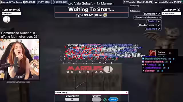 01:25:53Es werden Murmelrunden gespielt. Zuschauer können mit dem Befehl "!play" teilnehmen, unabhängig davon, ob sie Subscriber sind oder nicht. Wer als Letzter ins Ziel kommt, wird möglicherweise für immer gebannt, während der Erste, der kein Sub ist, einen Sub geschenkt bekommt oder VIP wird, falls er bereits Sub ist. Für fünf Subs kann man sich eventuell vom Bann freikaufen, aber das ist willkürlich und möglicherweise nicht erlaubt. Es wird überlegt, ob man den Stream nur mit Murmeln verbringen soll, und die Kategorie wird auf Marvels geändert. Es wird klargestellt, dass man kein Subscriber sein muss, um mitzuspielen, aber die Konsequenzen für den letzten Platz bleiben bestehen. Die Community hat den Streamer gescammt, indem sie mehr Murmelrunden pro Sub-Gift bekommen haben.