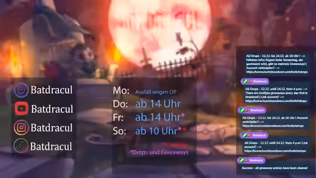 00:00:00Der Livestream beginnt um 16 Uhr mit mehreren wichtigen Ankündigungen. Zunächst wird die Aktion [!AllDrops] vorgestellt, die ab sofort für alle Zuschauer verfügbar ist. Ebenso wird ein Giveaway angekündigt, an dem die Community teilnehmen kann. Der Streamer stellt zudem ein bevorstehendes Zirkus-Event mit dem Titel 'Krampus' vor, das für Aufregung sorgt. Zusätzlich werden die Hashtags #ALDIGÖNNT und #huntersworld erwähnt, die im Verlauf des Streams eine wichtige Rolle spielen werden.