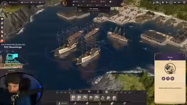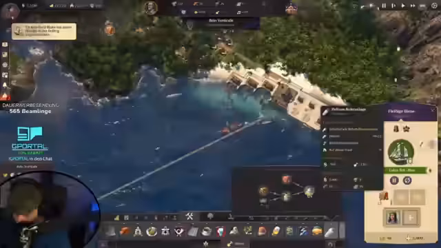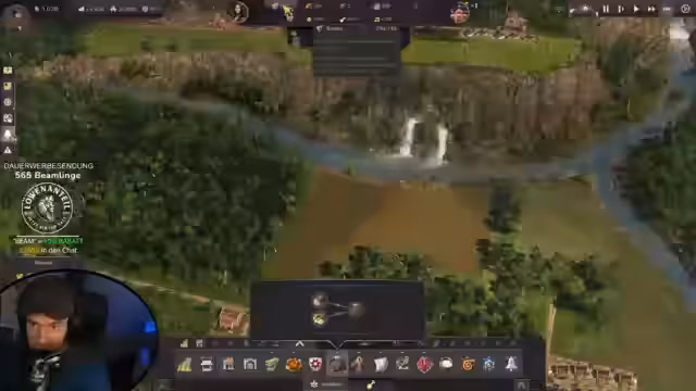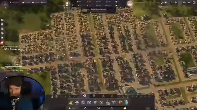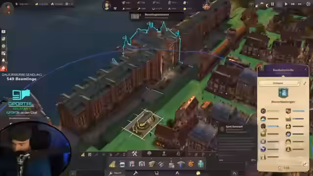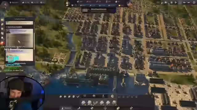 00:08:52Der Stream beginnt mit Begrüßungen der Chat-User und technischen Problemen des Streamers, der seinen Hauptbildschirm verloren hat und auf einen normalen Monitor umsteigen muss, was zu einer gewohnten Wahrnehmungsverzerrung führt. Anschließend wird der aktuelle Spielstand von Anno 1800 vorgestellt, eine sich entwickelnde Metropole mit Touristenhafen, Zoo, Stadtmauer und Speicherstadt. Die Gesamtbevölkerung liegt bei 16.800. Das große Ziel für diese Session ist der Bau von Luftschiffen.
