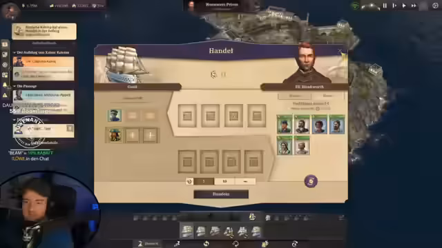 00:15:24Der Streamer konzentriert sich auf den Bau eines Luftschiff-Hangars. Für Phase 2 werden Ressourcen wie Bretter und Ziegelsteine benötigt. Parallel dazu wird die Handelsstrategie optimiert, indem eine vierte Handelsroute mit Glas und Pelzmäntel eingerichtet wird. Ein Tauschverhältnis von 2 zu 1 für Pelzmäntel wird als deutlich besser empfunden. Die Fensterproduktion wird stark ausgebaut, was jedoch zu Engpässen bei den Arbeitskräften und der Broterzeugnisversorgung führt.