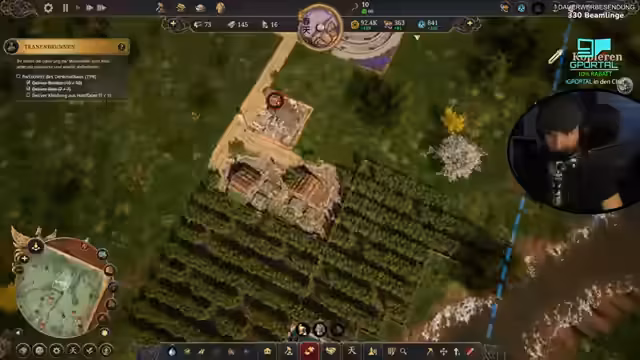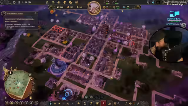 00:36:39Nachdem die Grundversorgung gesichert ist, wendet sich der Streamer dem Glauben zu. Er baut Schreine, um Glaubenspunkte zu generieren und sich einen Patron auszusuchen, der Boni für die Stadt bringt. Ein Dämonenangriff demonstriert die Wichtigkeit der Schreine, die einen Schutzschild um sich erzeugen. Gleichzeitig wird der Technologiebaum weitergeforscht, um die Produktivität zu steigern und neue Gebäude wie Handwerkerhäuser freizuschalten.