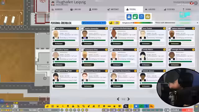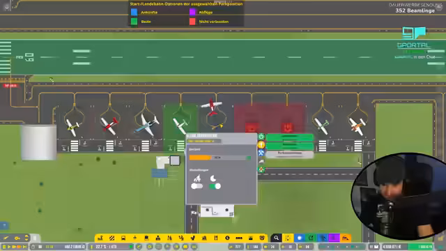 02:39:59Die Landebahn wird fertiggestellt und mit dem Terminal verbunden. Der Flughafen wird für internationale Flüge geöffnet, wobei zunächst nur mittelgroße Flugzeuge zugelassen werden. Es werden Verträge mit Fluggesellschaften abgeschlossen, wobei eine Fünf-Sterne-Fluggesellschaft bevorzugt wird. Der erste Flug wird abgefertigt, wobei es anfänglich zu Problemen mit der Wegfindung der Mitarbeiter kommt. Es wird ein Sicherheitsbereich für Mitarbeiter eingerichtet, um das Problem zu beheben. Der Streamer äußert Unzufriedenheit darüber, dass er die großen Maschinen nicht selbst zuordnen kann. Es wird ein Flugzeugschlepper bestellt, um größere Flugzeuge bewegen zu können. Es wird überlegt, die Verträge mit den Fluggesellschaften zu kündigen, da diese unzufrieden sind. Der erste große Flug wird abgefertigt, wobei es zu Verspätungen kommt. Es wird festgestellt, dass ein großer Förderbandwagen für das Gepäck fehlt. Nach der Ankunft des Gepäckwagens kann der Flug mit Verspätung starten. Der Streamer aktiviert zusätzliche Services wie Flugzeugkabinereinigung und Enteisungssystem.
