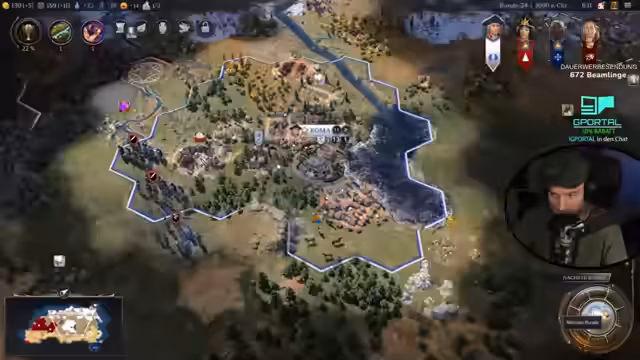 01:27:10Die neu gegründete Stadt entwickelt sich, und ein Handelsweg zwischen den Städten entsteht automatisch. Der Streamer plant, in Roma das Wunder 'Tor der Länder' zu bauen, da es zeitlose Boni bei Kriegen bietet. Langfristige Ziele wie die 'Terrakotta-Armee' oder die 'Pyramiden' werden in Erwägung gezogen, während der Fokus auf Produktion, Infanterie und militärische Expansion liegt.