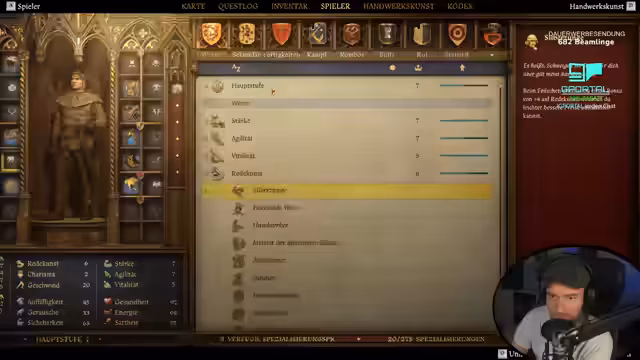 01:50:33Heinrichs Fähigkeiten werden verbessert. Man erhält Spezialisierungspunkte durch das Steigern seiner Stufen. Diese werden in Stärke und Agilität investiert. Stärke ist wichtig für Waffenschaden und Tragekapazität. Agilität verbessert Ausdauer und Senkt Fallschaden. Man erwägt, den Ruf schneller zu verbessern, um mehr Belohnungen zu erhalten. Anschließend werden Kampf-Fähigkeiten wie Ausweichen, Gegenschlag, standhaftes Blockieren und Genauiger Schlag angeschaut und aktiviert, um den Kampfwert zu erhöhen und Effizienz zu steigern.
