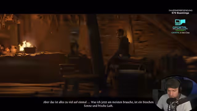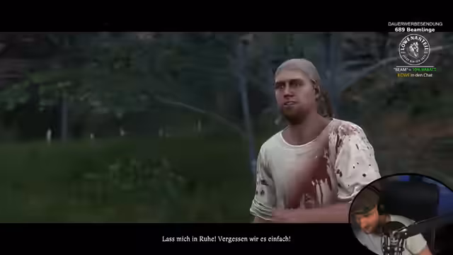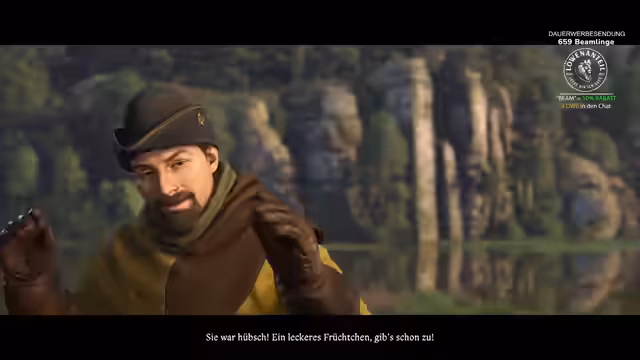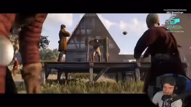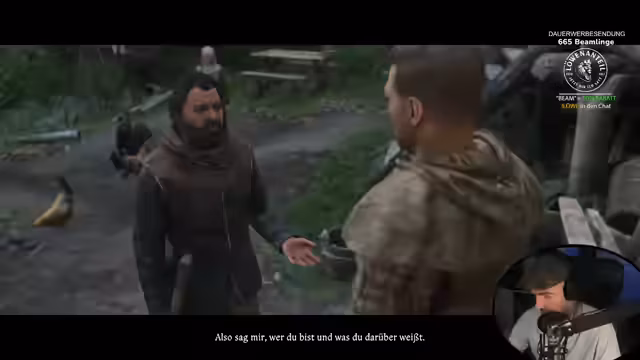 00:42:04Die idyllische Rast wird jäh unterbrochen, als Banditen das Lager überfallen. Es kommt zu einem Kampf, in dem Heinrich verwundet wird. Um zu überleben, müssen die beiden fliehen. Verfolgt von den Angreifern, geraten sie in eine gefährliche Situation am Rande einer Felsklippe. Der Streamer muss taktisch vorgehen, um die Angreifer zu umgehen und gleichzeitig den Verletzten Heinrich in Sicherheit zu bringen.