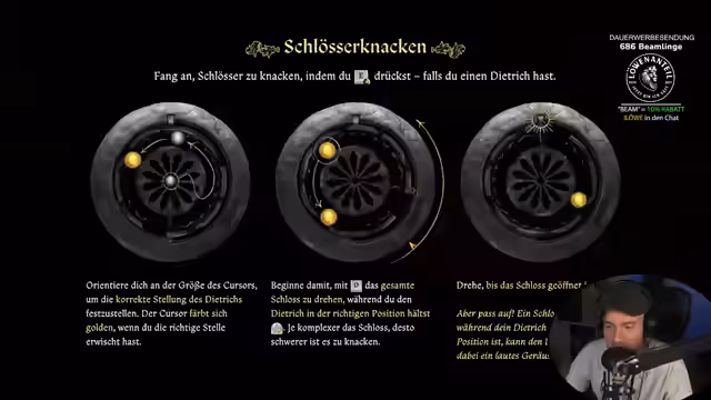 06:33:51Um in das Rathaus einzubrechen, sucht der Spieler die Diebesgilde auf und trifft dort auf Hänsel, der ihm die Grundlagen des Stehlens beibringt. Spieler lernt an einem NPC das Prinzip des heimlichen Taschendiebstahls, wobei ein Zeitfenster für erfolgreiches Blocken entscheidend ist. Nach erfolgreichem Training erhält der Spieler die Fähigkeit 'Stille Diebeskunst' und einen Punkt für Flinkfinger.