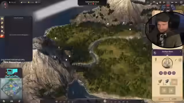 00:15:07Nach dem Erstellen eines neuen Spiels mit einem Flaggschiff beginnt der Streamer mit der Suche nach einer geeigneten Startinsel. Er sucht nach Inseln mit mindestens zwei Lehmvorkommen und wichtigen Ressourcen wie Kartoffeln, Weizen, Hopfen und Eisen. Nach längerer Suche entscheidet er sich für eine Insel mit zwei Lehm-, zwei Eisen- und einem Zinkvorkommen, obwohl sie nicht ideal groß ist. Er beginnt sofort mit dem Bau von Holzfällerhütten und einem Kontor.