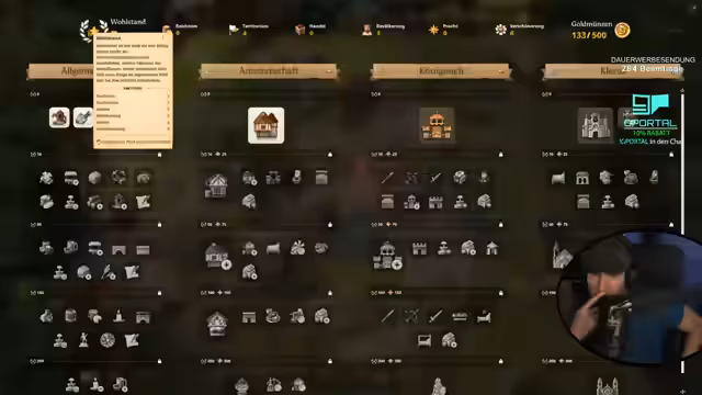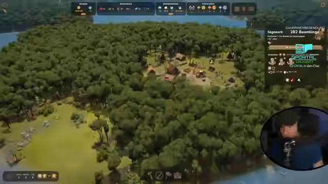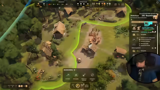 01:32:35Um die Zufriedenheit zu verbessern und edles Essen zu beschaffen, wird der Bau einer Jagdhütte freigeschaltet und begonnen. Diese produziert Wildschwein in Waldgebieten. Das Problem der begrenzten Territorialgrenzen und mangelnder Goldmünzen wird erkannt. Währenddessen wird das Ziel verfolgt, durch den Verkauf von Brettern über Handel eine zusätzliche Einnahmequelle zu schaffen, da sich die Steuereinnahmen als langsam erweisen.