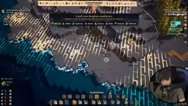 00:17:19Kurz nach der Gründung erscheint der erste Steuerbescheid. Es müssen 83 Gold in zwei Tagen gezahlt werden. Das Spiel verlangt, Ressourcen wie Flachs, Holz und Baumwolle für die Steuerzahlung zu nutzen, die unterschiedliche Werte haben. Gleichzeitig erhält der Streamer die erste Quest, ein Bergbaulager zu bauen, um später Dorfbewohner zu rekrutieren. Parallel dazu herrscht Wohnungsnot, da die ersten fünf Mäuse keinen festen Wohnplatz haben, was zu negativen Stimmungspunkten führt.