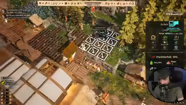 01:52:30Der Streamer stellt fest, dass die Bewohner eine zu niedrige Wohnqualität aufweisen. Negative Gedanken, die durch unbequeme Kleidung und schmutzige Nahrung verursacht werden, verringern die Effizienz. Um dies zu beheben, plant er den Bau von besseren Häusern wie dem Plankenhaus und einem Weber zur Kleidungsproduktion. Ebenfalls wichtig ist das Bezahlen der Steuern, wofür ausreichend Ressourcen in den Lagern vorhanden sein müssen. Das Spiel belohnt die Steuerzahlung mit positiven Effekten wie mehr Aufnahmekapazität für neue Bewohner.