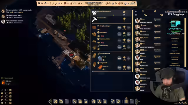 01:38:46Die Produktion von Planken erweist sich als Hauptengpass, da der Abbau und die Verarbeitung von Holz unzureichend sind. Der Streamer beschließt, ein zweites Sägewerk zu bauen und stellt fest, dass die Produktion durch die Spezialisierung der Arbeiter in Gilden optimiert werden kann. Ingenieursgilden erhöhen die Effizienz in Fabriken. Gleichzeitig entstehen logistische Probleme, da die Arbeiter für den Transport der Ressourcen von den entfernten Abbaugebieten zu den Lagern zu viel Zeit benötigen. Der Bau von Wegen und Lagern wird priorisiert, um die Warenflüsse zu verbessern.