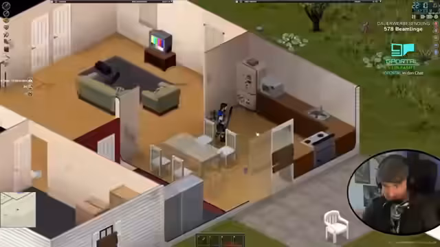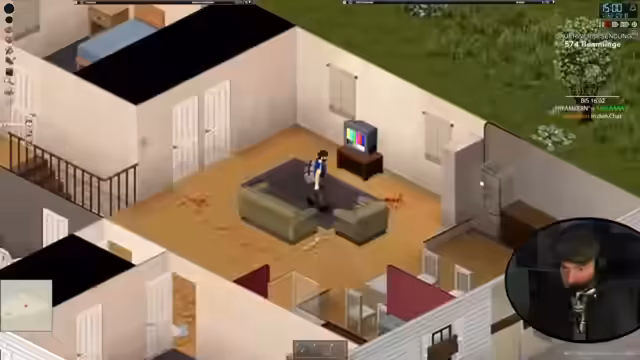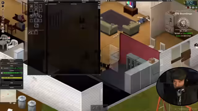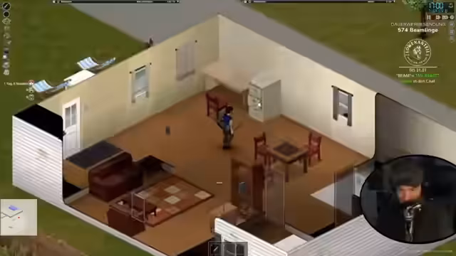 00:08:26Der Stream beginnt mit dem Ziel, in Project Zomboid einen neuen Run als Anfänger zu starten. Der Charakter ist als Arbeitsloser gestartet und besitzt hohe Stärke, ist aber übergewichtig und benötigt daher mehr Nahrung. Es wird die Version 4.2 mit ausschließlich Komfort-Mods gespielt. Nach dem Spawn in Rosewood wird ein Haus als erste Basis eingerichtet. Es wird nach verwertbarem Loot wie einem Bleirohr als improvisierte Waffe, Nahrung, Werkzeugen wie Schere und Schaufel sowie Gegenständen zur Verbesserung des Inventars gesucht. Der Plan ist, schnell ein Fahrzeug zu finden, bevor der Charakter stirbt.