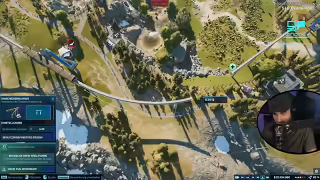 01:14:45Nachdem die akuten Krisen bewältigt sind, widmet sich der Streamer dem Ausbau der Infrastruktur. Er baut ein großes Umspannwerk und eine Einschienenbahn, um die Transportbewertung zu verbessern. Parallel dazu beginnt er mit dem Bau der 'Ballon-Tour', die einen tollen Blick auf den Park und die Dinos bieten soll, und testet diese bereits live.