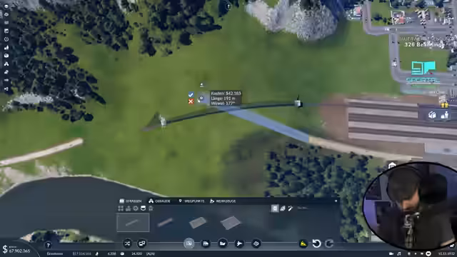 01:51:31Der Bau eines umfangreichen Zugnetzes im Gebirge beginnt mit der Konstruktion mehrerer Brücken. Hierbei werden sowohl Landstraßen als auch Eisenbahnverbindungen über Schluchten und Täuber errichtet. Parallel dazu wird die Umgebung mittels Terraforming-Tools an die geplanten Infrastrukturbauten angepasst, um eine realistischere und optisch ansprechendere Landschaft zu schaffen. Der Fokus liegt auf der geschickten Einbindung der Strecken in die bestehende, bergige Topographie.