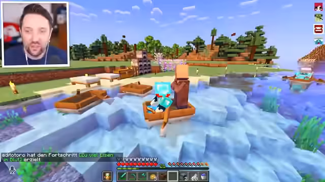 00:42:11Nach der finalen Verständigung der technischen Details und nachdem die IP-Adresse empfangen wurde, wird die Verbindung zum Minecraft-Server für Craft Attack 13 hergestellt. Es kommt zu einem kurzen Chaos, in dem die Teilnehmer im Spawn-Bereich erscheinen und sich sofort orientieren müssen. Der Clantag wird geändert, der Spawn erkundet und es wird über die strategische Positionierung der Basis im Hinblick auf Nachbarn und potenzielle PvP-Konflikte gesprochen.