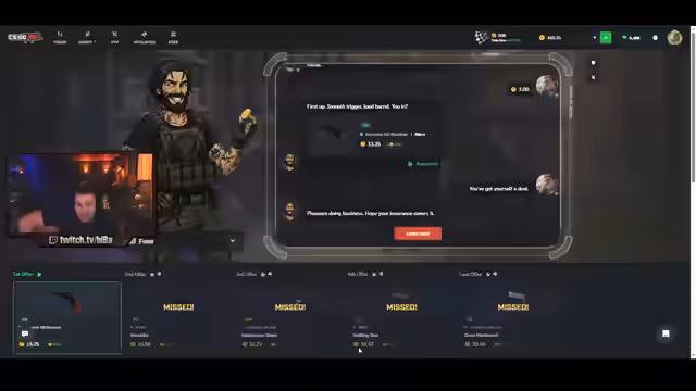 03:25:05Nachdem er in einem Jackpot-Modus extrem Pech hatte, entdeckt der Streamer einen anderen Spielmodus namens 'Trade-Up Contract'. Er vergleicht diesen Mechanismus mit den bekannten 'Trade-Up-Contracts' aus dem Spiel und auf anderen Webseiten. Hierbei zahlt man einen bestimmten Betrag und erhält im Gegenzug ein Item mit einem zufälligen Wert, der weit unter dem Einsatz liegen kann. Er testet diese Funktion mehrfach, wird aber von den Angeboten enttäuscht und beschreibt die Angebote als 'Müll'.