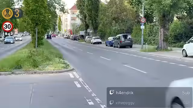 00:03:40Ein wichtiges Thema ist die Position des Blitzers, der unmittelbar nach einem 30er-Schild aufgestellt zu sein scheint. Mehrere Zuschauer äußern den Verdacht, dass dies illegal sei, da die Geschwindigkeitsmessung erst nach dem Schild beginnen dürfte. Der Streamer dokumentiert die Szene und bittet die Community, ggf. einen Widerspruch oder eine Anzeige online bei der Berliner Polizei zu erstatten. Es wird auch eine kleine Aktion gestartet, bei der man Herzen senden soll, wenn man den Blitz tatsächlich sieht.