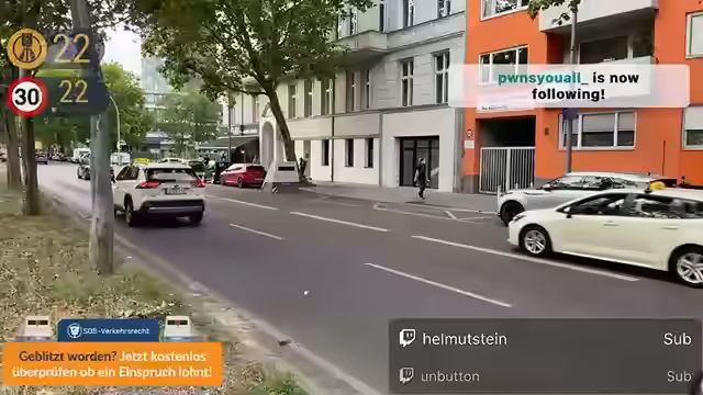 00:02:01Hauptinhalt des Streams ist die Beobachtung von Blitzern in Berlin. Dabei werden kontinuierlich vorbeifahrende Fahrzeuge erfasst und deren Geschwindigkeit kommentiert. Der Streamer ruft die Zuschauer auf, durch Daumen hoch anzuzeigen, ob sie einen Blitzer erkennen. Es gibt wiederkehrende Wortspiele wie "Blitzerbiest" und "Hengenpenner". Auch Umfragen zur Farbgebung der zu erwartenden Fahrzeuge (hell/dunkel) werden durchgeführt, um die Interaktion zu fördern.