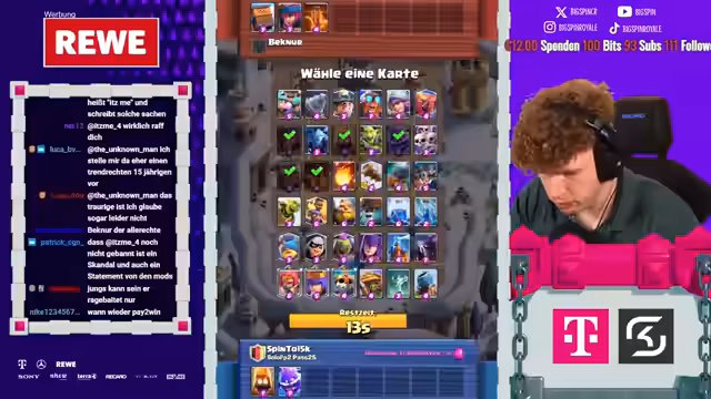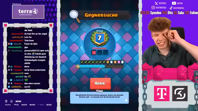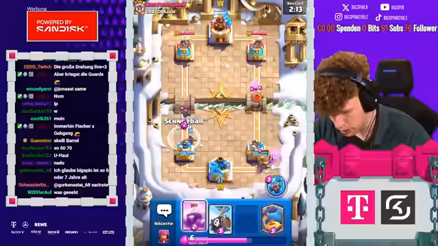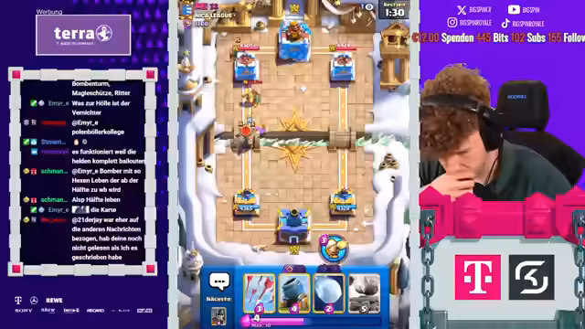 02:44:00Der Streamer ist frustriert über eine Reihe unglücklicher Verluste. Er kritisiert, dass der Gegner zu oft mit einem aggressiven Prinzessin-Zug erfolgreich ist, während er selbst keine effektive Antwort darauf hat. Zudem fehlt es ihm an starken, teuren Karten, um wirklich gegen ausbalancierte Gegner-Decks bestehen zu können. Trotzdem bleibt er motiviert und möchte unbedingt höher als die aktuelle Siegesserie von 5-1 kommen.