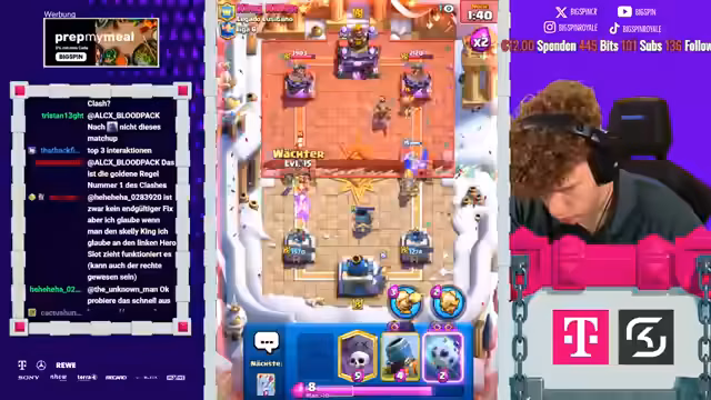 02:53:11Nach einer erfolgreichen Offensive, die den Turm des Gegners zerstört, wird dieser als 'Flasche leer' beschrieben. Eine Kombination mit Karten wie Bomber, Ice-Buller und Skelly-Barrell wird als guter Damage und 'sehr, sehr, Freunde. Geiles Game.' bewertet. Nach dem Sieg steigt der Stand auf 7-1, und die Möglichkeit eines '12er-Runs' wird als sehr positiv und spannend eingestuft.