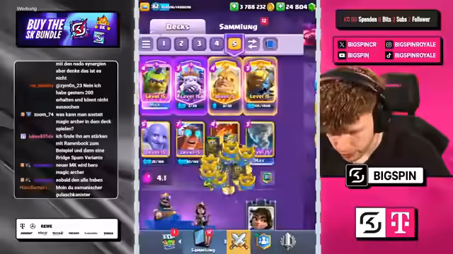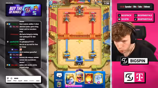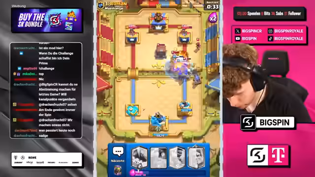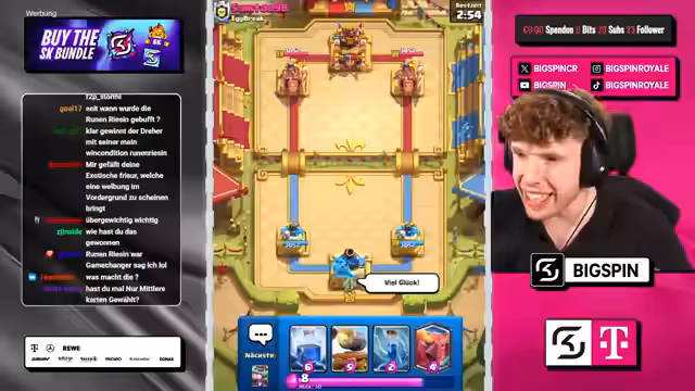02:36:03Während des Spiels trifft der Streamer eine riskante Entscheidung, da seine letzte Karte per Zufall ausgesucht wird. Er äußert Bedenken gegen mögliche gegnerische Karten wie Skami. Trotz der Unsicherheit führt sein gut zusammengestelltes Deck mit Karten wie Bossbanditin und Bowler zum Sieg. Das Gegenüber ist überfordert und der Streamer sichert sich den 3-Kronen-Sieg sowie den 4. Sieg in der Challenge.