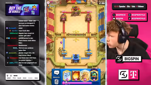 02:55:16In den folgenden Spielen gegen Jo Schulf und einen Gegner namens Z tauchen Probleme auf. Gegen den Inferno-Turm im Deck des Gegners fehlt dem Streamer eine direkte Antwort, was ihn unter Druck setzt. Auch gegen einen Golem-basierten Deck mit Guards hat er Schwierigkeiten, das Deck zu kontrollieren. Diese Matches sind geprägt von taktischen Fehlern und dem Fehlen von Schlüsselkarten, was zu weiteren Niederlagen führt.