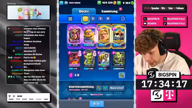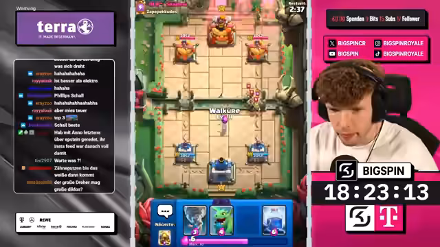 01:30:00Geführt von einem etablierten und hochgelevelten Deck aus Karten wie Sparky, Hexe und Ritter, gelingt es dem Streamer, die notwendigen Siege einzufahren. Gegen teils überlevelte Gegner, die mechanisch nicht gewachsen sind, erkämpft er sich Sieg um Sieg. Nach etwa vier Spielen erreicht er das Ziel von 10.000 Trophäen beweist, dass es auch im Free-to-Play-Modus möglich ist, diesen Meilenstein zu erreichen.