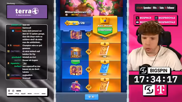 01:22:33Der Streamer beginnt mit der Eröffnung des vermutlich letzten Pass-Royal im Hardcore-Free-To-Projekt. Mit noch 18 Stunden Laufzeit wird dieser Pass als entscheidend angesehen, um eine Karte auf Level 16 zu bringen. Es gibt eine breite Auswahl an Karten, die bereits auf hohem Level sind, wie die Hexe, den Ritter und den Skelly King. Trotzdem wurde bisher kein einziger normaler 5-Sterne-Drop erhalten, was die Spannung auf die bevorstehenden Lucky Lopes erhöht.