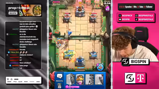 00:03:26Das Gameplay konzentriert sich auf die große Herausforderung im Clan, bei der es darum geht, Juwelen zu sammeln und den Pass-Royal freizuschalten. Nach einigen erfolgreichen Spielen, die zum Level 84 und 85 führen, äußert der Streamer Frustration über das Matchmaking. Er wird häufig gegen Bait-Decks wie Lava Hound und gegen Decks mit Evo-Mechanischem Magier und Inferno-Turm gepaart, die er als übermächtig und unfair empfindet. Dies führt zu mehreren Niederlagen.