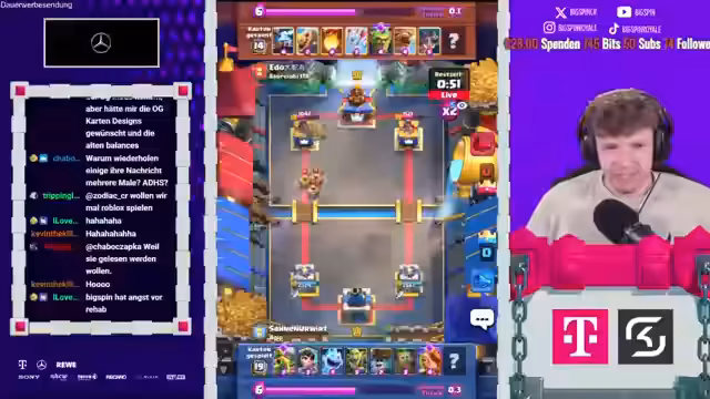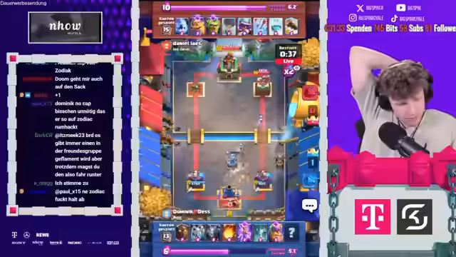02:21:58Die Live-Duelle beginnen mit intensiven Spielen und Backseat-Gaming von Kommentatoren. Es werden Decks wie Giant und Prinz als übermächtig kritisiert. Es kommt zu lustigen Anekdoten, wie der Vergleich eines Spielers mit Jeffrey Dahmer und Diskussionen über frühere Gaming-Wetten. Der Streamer bittet das Chat-Publikum, sich ruhig zu verhalten und Fokus aufs Spiel zu legen. Die Stimmung ist geprägt von Wettbewerb, strategischen Taktiken und humorvollen Einlagen.