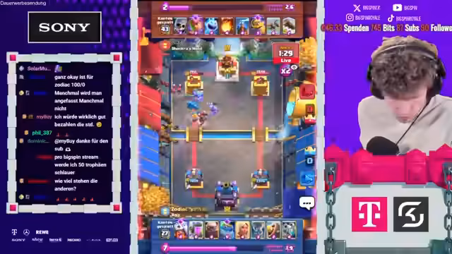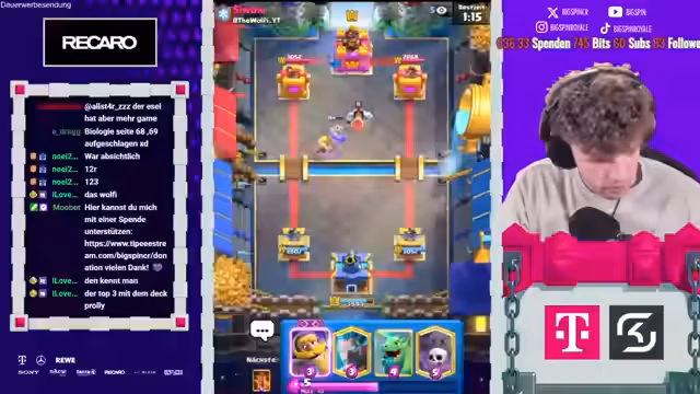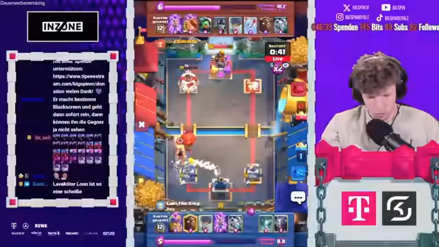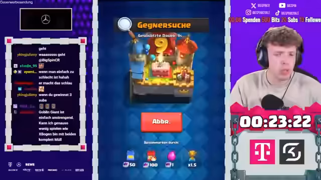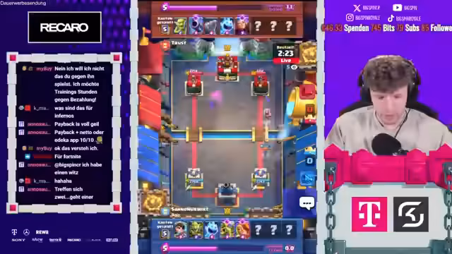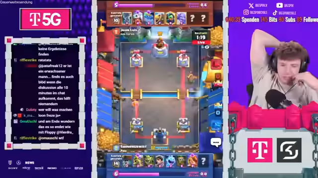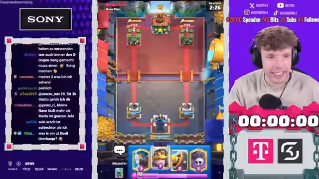 00:40:26Nach dem Verlust des ersten Spiels versucht der Streamer, ein angepasstes Deck mit Truppen wie dem Sepp und dem Megaritter zu spielen. Eine taktische Fehlentscheidung, bei der er den Frankenstein-Knight zu früh einsetzt, ermöglicht dem Gegner, den Bogenschützen zu kontrollieren. Trotz eines späten X-Bogen-Versuchs verliert das Spiel letztendlich, was den Streamer verärgert und zu der resignierenden Feststellung führt, dass er nur gegen die 'größten Schwitzer' spielt.