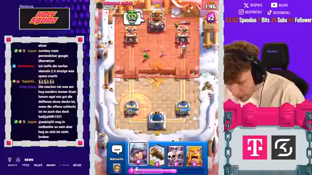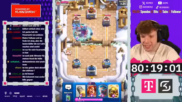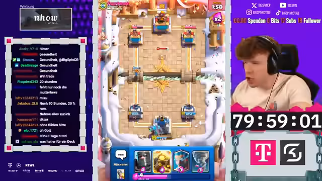 01:16:55Im ersten Spiel gegen den Gegner werden die taktischen Herausforderungen deutlich. Der Gegner spielt ein starkes Deck mit Karten wie Goblin Barrel und Hexe, das schwer zu verteidigen ist. Trotzdem schafft es der Streamer, das Spiel mit einem cleveren Zug am Ende zu gewinnen. Der Schlüsselmoment ist der Einsatz von Sparky, der den Gegner zur Überforderung bringt. Es ist ein sehr packendes und gelungenes Match.