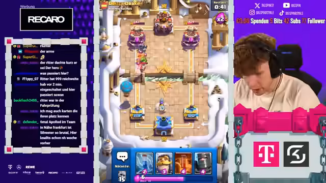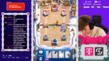 00:03:17Der Streamer beginnt mit dem Spielen der Grand Challenge (GC) auf seinem Account. Ziel ist es, diese Challenge auf jeden Fall zu absolvieren. Zudem wird der Timer aktiviert, um die E-Mode-Karten aus dem Lucky Lob zu ziehen, was die Wahrscheinlichkeit erhöht, dass Gegner weniger E-Mode-Karten erhalten. Ein Gegner wird mit einem Royalen Riesen-Deck identifiziert und das erste Match beginnt.