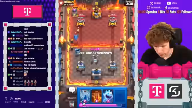 02:28:48Das Streamer-Team startet ein Match, das schnell gegen sie ausgeht. Sie wählen ein Goblin Giant-Deck, doch der Gegner spielt ein mächtiges Doppel-Prinz-Deck. Der Streamer analysiert das Match-Up als aussichtslos und frustriert, da sie keine Karten gegen die Kombination haben und schließlich das Spiel verlieren. Der Gegner zusätzlichBMt, was den Frust verstärkt. Er ist unzufrieden mit der Deck-Wahl und sieht keine Chance gegen diese Konfiguration.