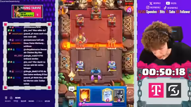 04:28:44Das Spiel startet gegen Zodiac, eine als stark geltende Deck-Variante. Der Streamer setzt auf ein Deck mit Rekruten, Evo Dart Goblin und Evo Wallbreaker. Die zentrale Taktik ist, Gegner-Evolutionen wie die Evo Valkyrie zu meiden, da diese extrem stark sind. Der Gegner nutzt gut Evo Crackerin und Dart Goblin, was zu einem gefährlichen Zustand führt, in dem der Streamer angreifen muss, aber gleichzeitig riskiert, überrollt zu werden. Das Spiel endet mit einer knappen Niederlage gegen einen als sehr gut bewerteten Gegner.