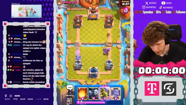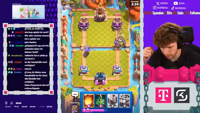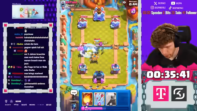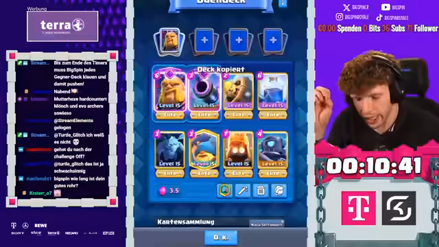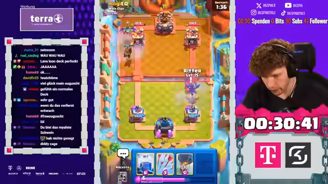 00:37:31Der Streamer setzt die Deckbau-Challenge fort, aber hat Pech bei der Kartenauswahl. Er wählt die Reskits und den Poison. Er vergibt sich bei der Auswahl und bekommt eine schlechte Kartenauswahl. Er hat nur eine Evolution im Deck und ist unzufrieden mit dem Ergebnis. Im Spiel gegen einen Lava-Hund-Spieler hat er große Probleme, da ihm die passenden Karten fehlen. Er wird von Clash Royale veräppelt, da er Karten, die er zuvor abgelehnt hat, erneut angeboten bekommt. Trotz einiger guter Spielzüge verliert er das Spiel aufgrund der schlechten Deckzusammenstellung und des fehlenden Flächenschadens. Der Streamer ist frustriert über den Spielverlauf und die unglückliche Kartenauswahl.