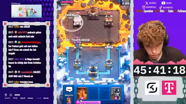 01:55:04Der Stream beginnt mit einer Diskussion über das Sehen von Stimmen und Farben, während der Fokus auf das Projekt und das Erreichen einer hohen Pokalhöhe liegt. Nach zwei Tagen ohne Spielen wird das Gameplay bewertet, wobei der Streamer meint, dass noch Potenzial nach oben besteht. Der erste Gegner 'der Dumme' wird thematisiert, und es wird über seine Karten und Strategien spekuliert. Der Streamer analysiert seine eigenen Spielzüge, bemängelt eine schlechte Reihenfolge und reflektiert über die Frustration des Gegners. Es wird über Karten wie Frostzauber, Pekka und Zepis diskutiert, während der Streamer seine Entscheidungen kritisch hinterfragt und sich auf das Einrooven konzentriert, um zukünftige Spiele zu gewinnen. Diese Phase legt den Grundstein für die weitere Analyse der Ladder-Push-Bemühungen.